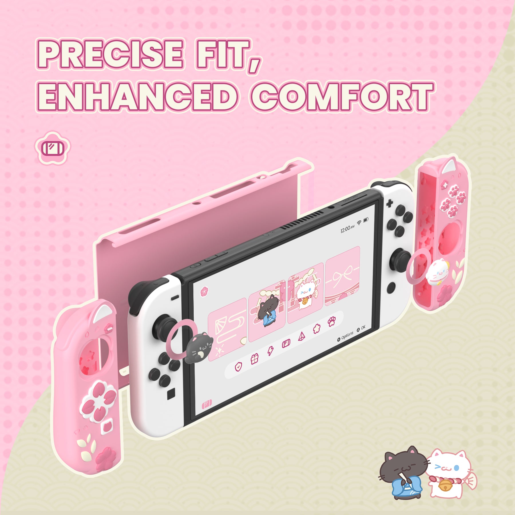 3. Decorated with kimono-clad twin cats and cherry blossom patterns, the switch oled case brings a joyful, spring-inspired look to your setup. The design features one white and one gray cat, adding personality while helping shield the device from scratches and everyday wear.